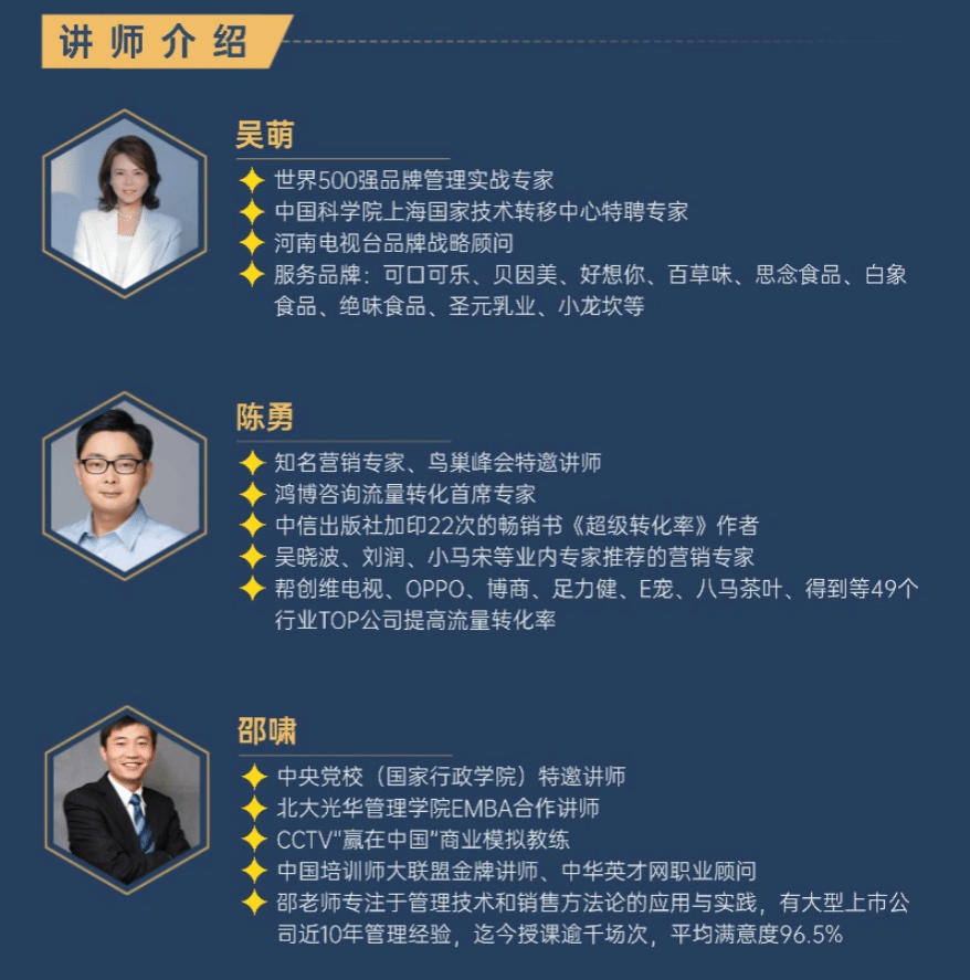 据悉,本期课程围绕“品牌打造与业绩增长”主题,特邀世界500强品牌管理实战专家吴萌、畅销书《超级转化率》作者陈勇,中央党校特邀讲师邵啸等知名专家授课。课程内容涵盖《占领顾客心智的低成本品牌打法》《超级转化驱动业绩利润双增长》《策略销售-大客户赢单法则》等实战模块,结合品牌营销智享会、项目路演、私董会等多种形式,助力学员提升企业运营与市场拓展能力。